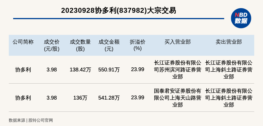 每經訊,2023年9月28日,新三板基礎層公司協多利(837982,收盤價:3.21元)發生2筆大宗交易,總成交金額為1092.19萬元,成交金額最高的一筆成交價3.98元/股,成交數量138.42萬股,成交金額550.91萬元,溢價23.99%。買入營業部是長江證券股份有限公司蘇州濱河路證券營業部,賣出營業部是長江證券股份有限公司上海斜土路證券營業部。