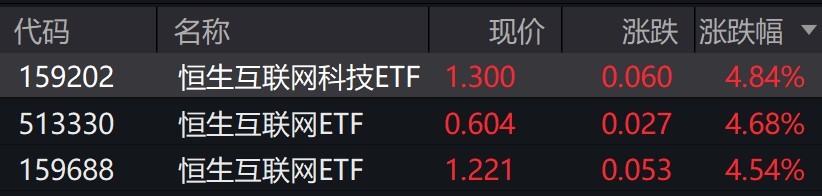 受盤面影響,恒生互聯網相關ETF漲超4%。