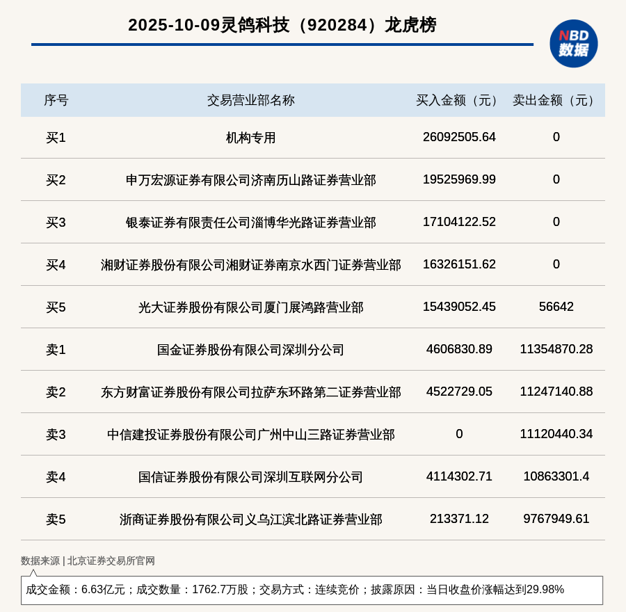 每經訊,2025年10月9日,北交所上市公司靈鴿科技(920284,收盤價:39.41元)登上龍虎榜,交易方式是連續競價,披露原因是當日收盤價漲幅達到29.98%,成交數量1762.7萬股,成交金額6.63億元。買一席位為機構專用,買入2609.25萬元;賣一席位為國金證券股份有限公司深圳分公司,賣出1135.49萬元。