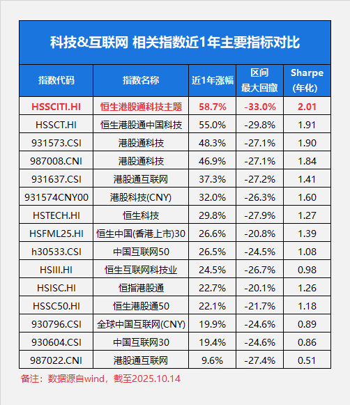 在眾多港股科技指數中,恒生港股通科技主題指數吸金或主要得益于其“三高”特征。Wind數據顯示,截至10月14日,該指數近一年漲幅達58.7%,夏普比率達2.01,這兩項指標均在全市場15只港股科技及互聯網主題指數(有掛鉤ETF的)中位居首位,也是唯一一只夏普比率突破2的港股科技指數。指數亮眼的表現源于指數編制設計:該指數嚴格限定科技行業范圍,剔除汽車、醫藥等非科技品類,聚焦AI+半導體領域,科技純度達到100%,為投資者提供了更純粹的港股硬科技資產投資工具。