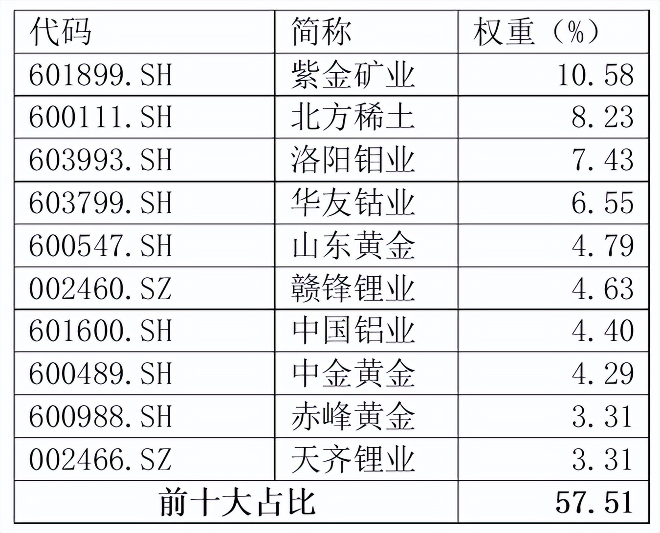 從前十大成分股來看,清一色“家里有礦”資源龍頭,前十大占比合計超57%,集中度相對也更高,銳度十足。