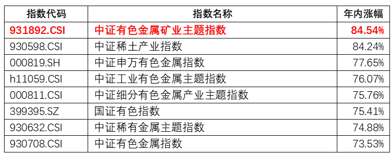 在眾多布局有色金屬的ETF產品中,礦業ETF(561330) 今年以來的漲幅顯著高于普通有色金屬類ETF。以礦業ETF跟蹤的中證有色金屬礦業主題指數為例,年內漲幅不僅顯著超越大部分有色指數,甚至也超過了稀土指數。