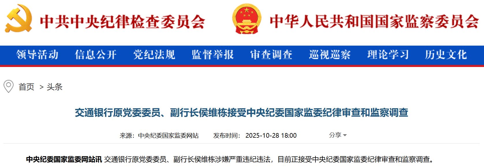 據央視新聞及中央紀委國家監委網站10月28日消息,交通銀行原黨委委員、副行長侯維棟因涉嫌嚴重違紀違法,正接受中央紀委國家監委的紀律審查和監察調查。