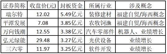 從封板資金來看,今日漲停板個股中,封板資金排名前5的個股包括瑞爾特、平潭發展、萬向錢潮、弘元綠能、三六零。歡迎大家關注微信公眾號“道達號”,其“道達漲停復盤”欄目為大家解讀。