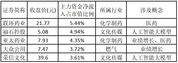 主力資金凈流入金額占市值比例排名前5的個股分別為聯環藥業、福石控股、亞太藥業、大眾公用、榮信文化。
