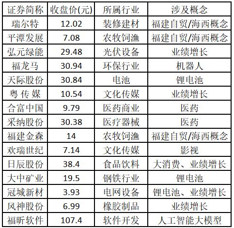 漲停板個股中,股價創出近一年新高的個股有15只(不包括創出歷史新高的個股),包括瑞爾特、平潭發展、弘元綠能、福龍馬、天際股份、粵傳媒、合富中國、采納股份、福建金森、歡瑞世紀、日辰股份、大中礦業、冠城新材、風神股份、福昕軟件,具體如下表所示。