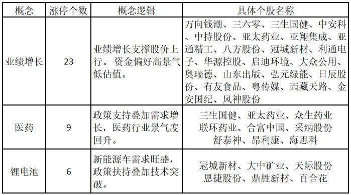 從概念特征來看,今日漲停板個股中,業績增長、醫藥、鋰電池概念的個股最多。