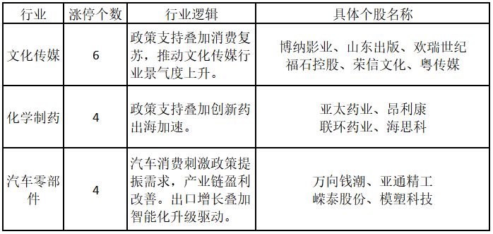 從行業特征來看,今日漲停板個股中,文化傳媒、化學制藥、汽車零部件行業的個股最多。