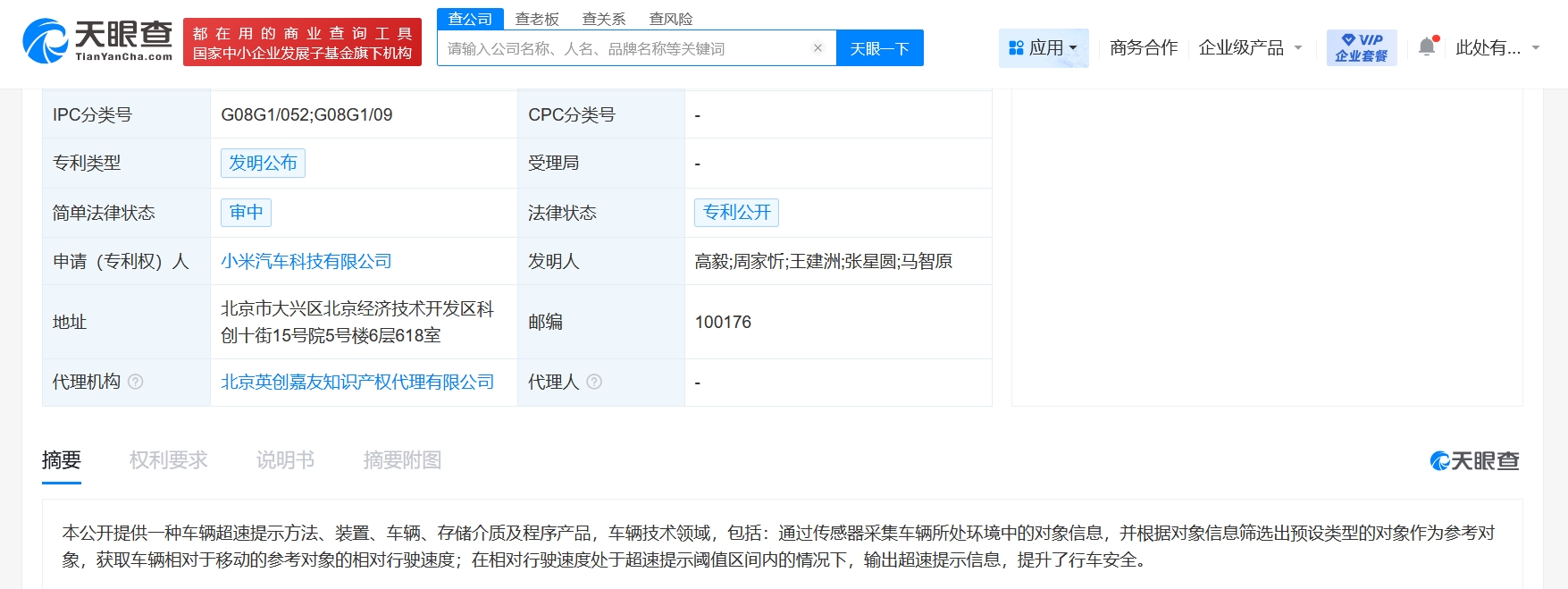 每經(jīng)AI快訊,天眼查App顯示,近日,小米汽車科技有限公司申請(qǐng)的“車輛超速提示方法、裝置、車輛、存儲(chǔ)介質(zhì)及程序產(chǎn)品”專利公布。摘要顯示,本公開涉及車輛技術(shù)領(lǐng)域,包括:通過傳感器采集車輛所處環(huán)境中的對(duì)象信息,并根據(jù)對(duì)象信息篩選出預(yù)設(shè)類型的對(duì)象作為參考對(duì)象,獲取車輛相對(duì)于移動(dòng)的參考對(duì)象的相對(duì)行駛速度;在相對(duì)行駛速度處于超速提示閾值區(qū)間內(nèi)的情況下,輸出超速提示信息,提升了行車安全。