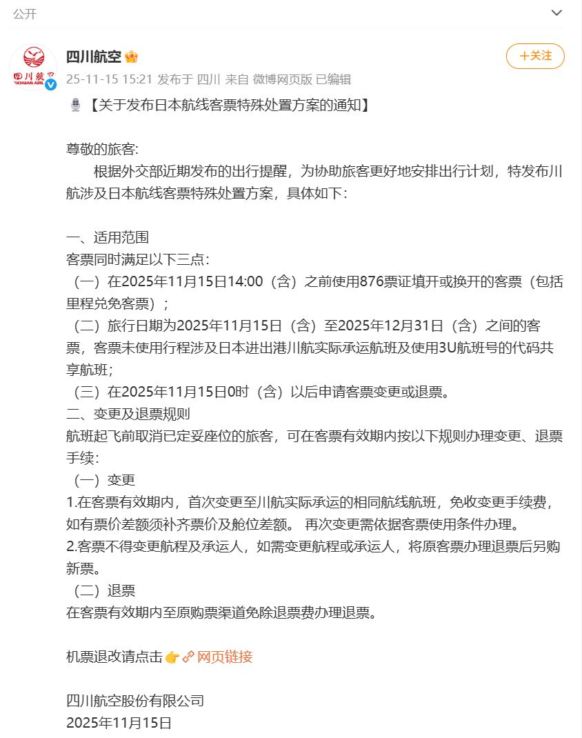 11月14日,因日本社會治安不靖,針對中國公民犯罪多發,且日本領導人發表涉臺挑釁言論,外交部提醒中國公民近期避免前往日本,在日公民需提高防范意識。15日,國航、南航、東航等多家航司發布涉及日本航線客票特殊處置方案,對符合條件的客票可免費退改,川航、廈航也發布了相關通知。