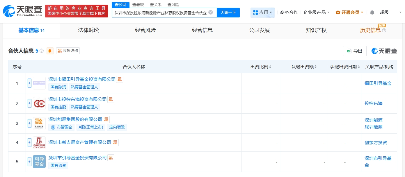 每經AI快訊,天眼查工商信息顯示,近日,深圳市深投控東海新能源產業私募股權投資基金合伙企業(有限合伙)成立,執行事務合伙人為深圳市投控東海投資有限公司,出資額10億元人民幣,經營范圍包括以私募基金從事股權投資、投資管理、資產管理等活動。合伙人信息顯示,該基金由深圳能源、深圳市投控東海投資有限公司、深圳市引導基金投資有限公司等共同出資。