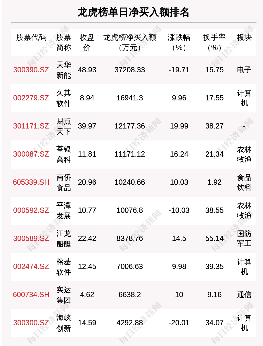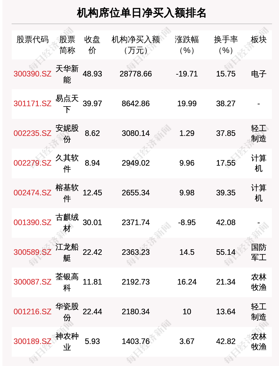 在龍虎榜中,涉及機構專用席位的個股有20只,凈買入額前三的是天華新能、易點天下、安妮股份,分別為2.88億元、8642.86萬元、3080.14萬元。