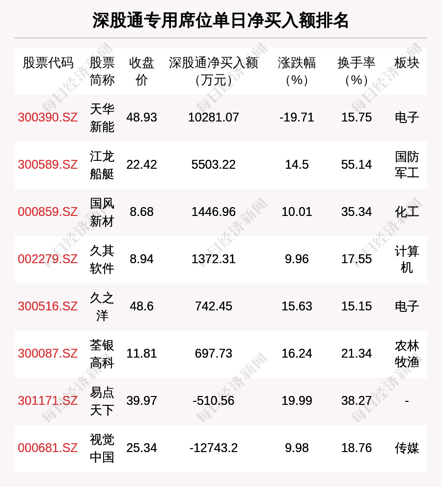 在龍虎榜中,涉及深股通專用席位的個股有8只,天華新能的深股通專用席位凈買入額最大,凈買入1.03億元。
