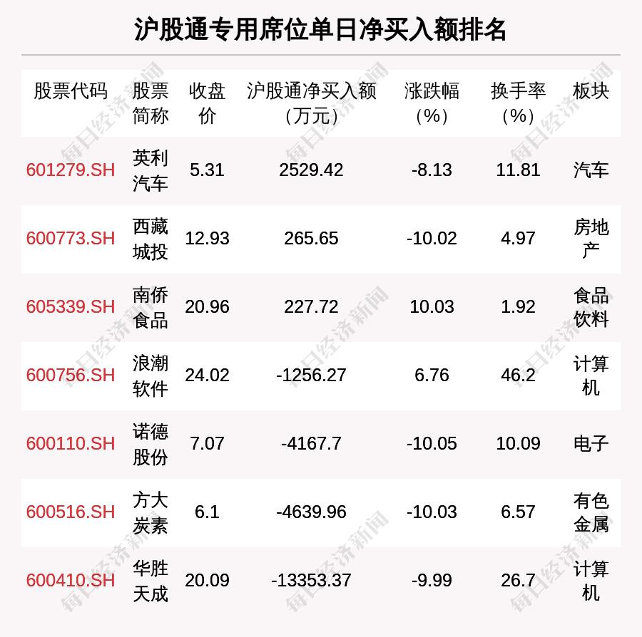 在龍虎榜中,涉及滬股通專用席位的個股有7只,英利汽車的滬股通專用席位凈買入額最大,凈買入2529.42萬元。