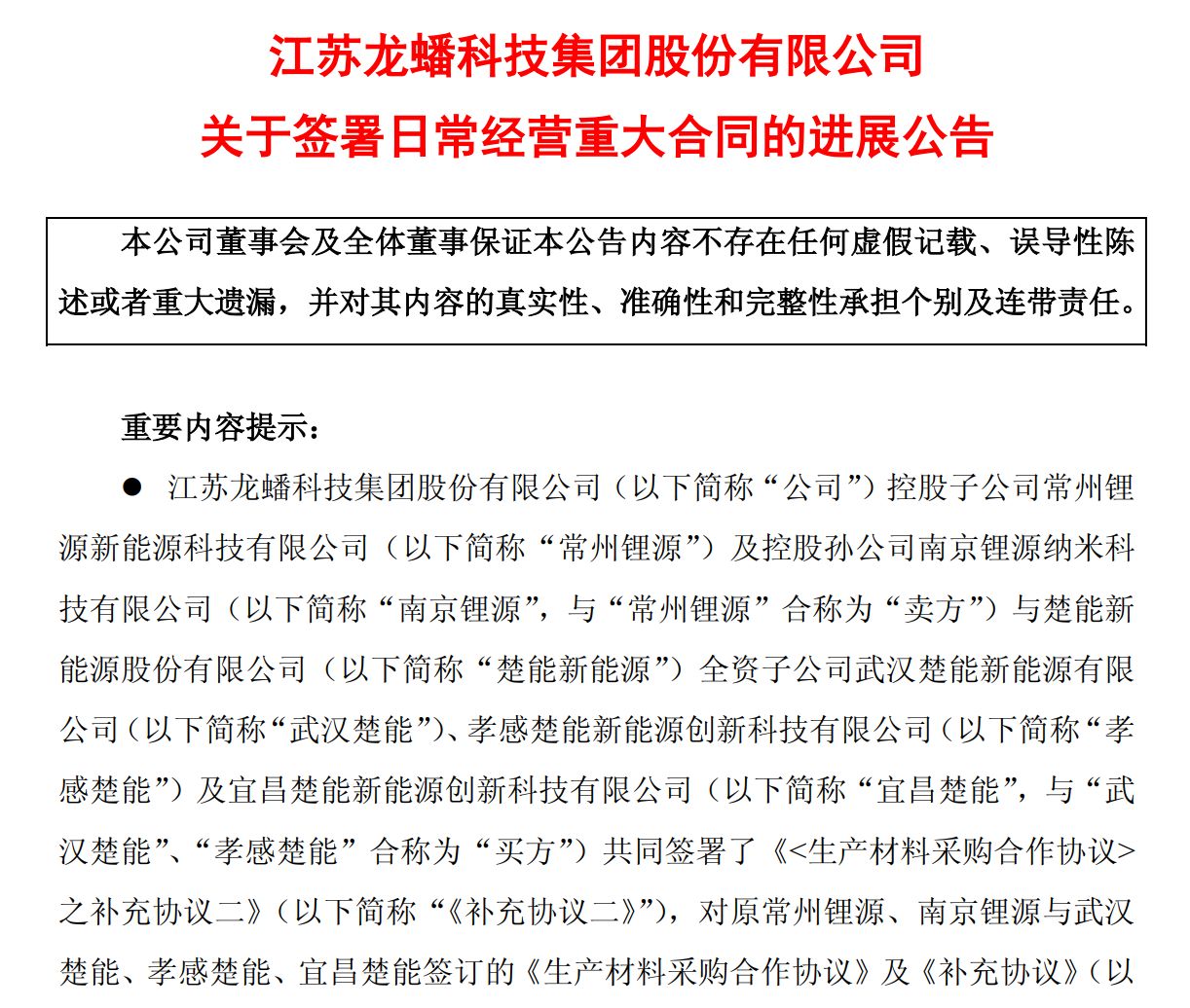11月24日晚間,龍蟠科技(603906.SH,股價16.42元,市值112.49億元)公告稱,公司控股子公司常州鋰源及控股孫公司南京鋰源(以下簡稱“賣方”)與楚能新能源全資子公司武漢楚能、孝感楚能及宜昌楚能(以下簡稱為“買方”)共同簽署了《補充協議二》,對原協議相關條款進行補充與修訂。