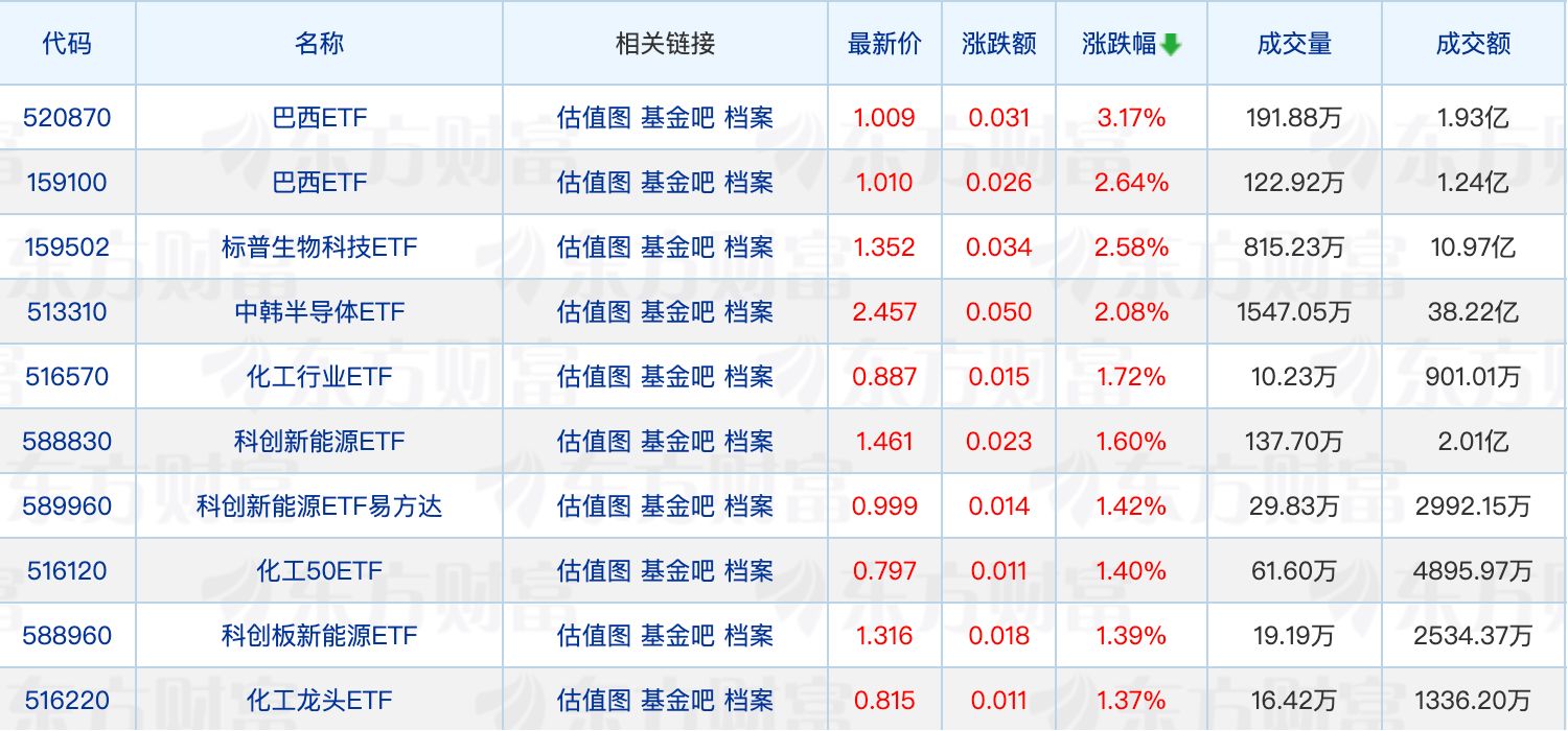 具體來看,兩只巴西ETF領漲,最大漲幅為3.17%;此外,化工ETF也有所表現。