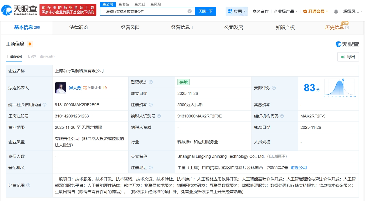 每經AI快訊,天眼查App顯示,近日,上海領行智航科技有限公司成立,法定代表人為崔大勇,注冊資本5000萬元人民幣,經營范圍包括人工智能應用軟件開發、人工智能基礎軟件開發、人工智能理論與算法軟件開發等。股權全景穿透圖顯示,該公司由T3出行旗下南京領行汽車服務有限公司全資持股。