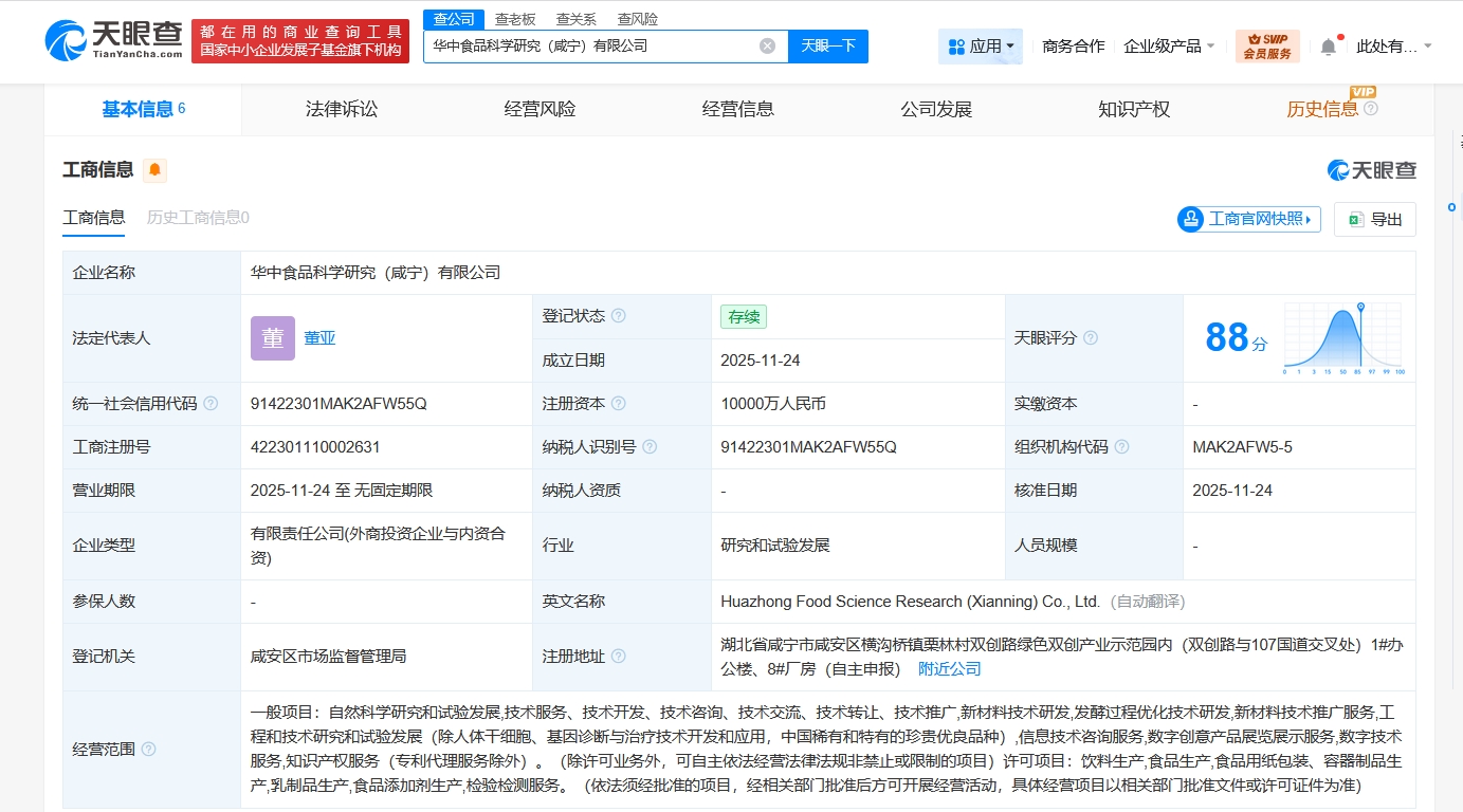 每經AI快訊,天眼查App顯示,近日,華中食品科學研究(咸寧)有限公司成立,法定代表人為董亞,注冊資本1億元人民幣,經營范圍含自然科學研究和試驗發展、新材料技術研發、發酵過程優化技術研發、新材料技術推廣服務、工程和技術研究和試驗發展、飲料生產、食品生產等,由咸寧高新產業發展有限公司、元氣森林(北京)食品科技集團有限公司分別持股90%、10%。