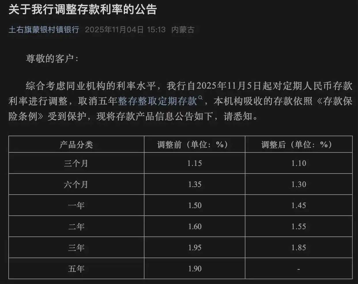11月初內蒙古土右旗蒙銀村鎮銀行發布公告稱,自2025年11月5日起,取消五年期整存整取定期存款。