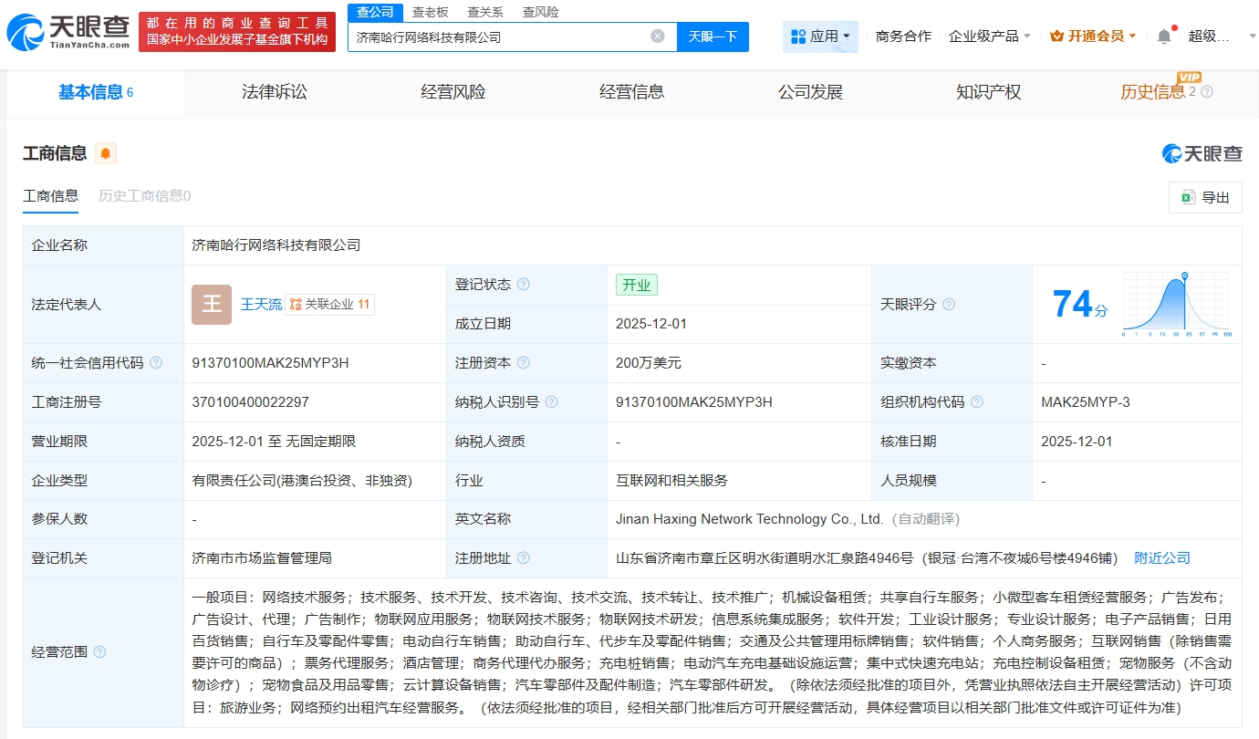 每經(jīng)AI快訊,天眼查App顯示,近日,濟(jì)南哈行網(wǎng)絡(luò)科技有限公司成立,法定代表人為王天流,注冊資本200萬美元,經(jīng)營范圍包括共享自行車服務(wù)、小微型客車租賃經(jīng)營服務(wù)、汽車零部件及配件制造、集中式快速充電站等。股東信息顯示,該公司由哈啰出行旗下HongKongRideTechLimited全資持股。