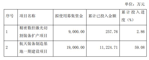 2020年7月,上海滬工發(fā)行4億元可轉(zhuǎn)換公司債券,用于“精密數(shù)控激光切割裝備擴(kuò)產(chǎn)項(xiàng)目”(以下簡稱數(shù)控激光項(xiàng)目)和“航天裝備項(xiàng)目”。按最初計(jì)劃,上海滬工擬向兩個(gè)項(xiàng)目各投資9000萬元和1.9億元,另有1.2億元用于補(bǔ)充流動(dòng)資金。