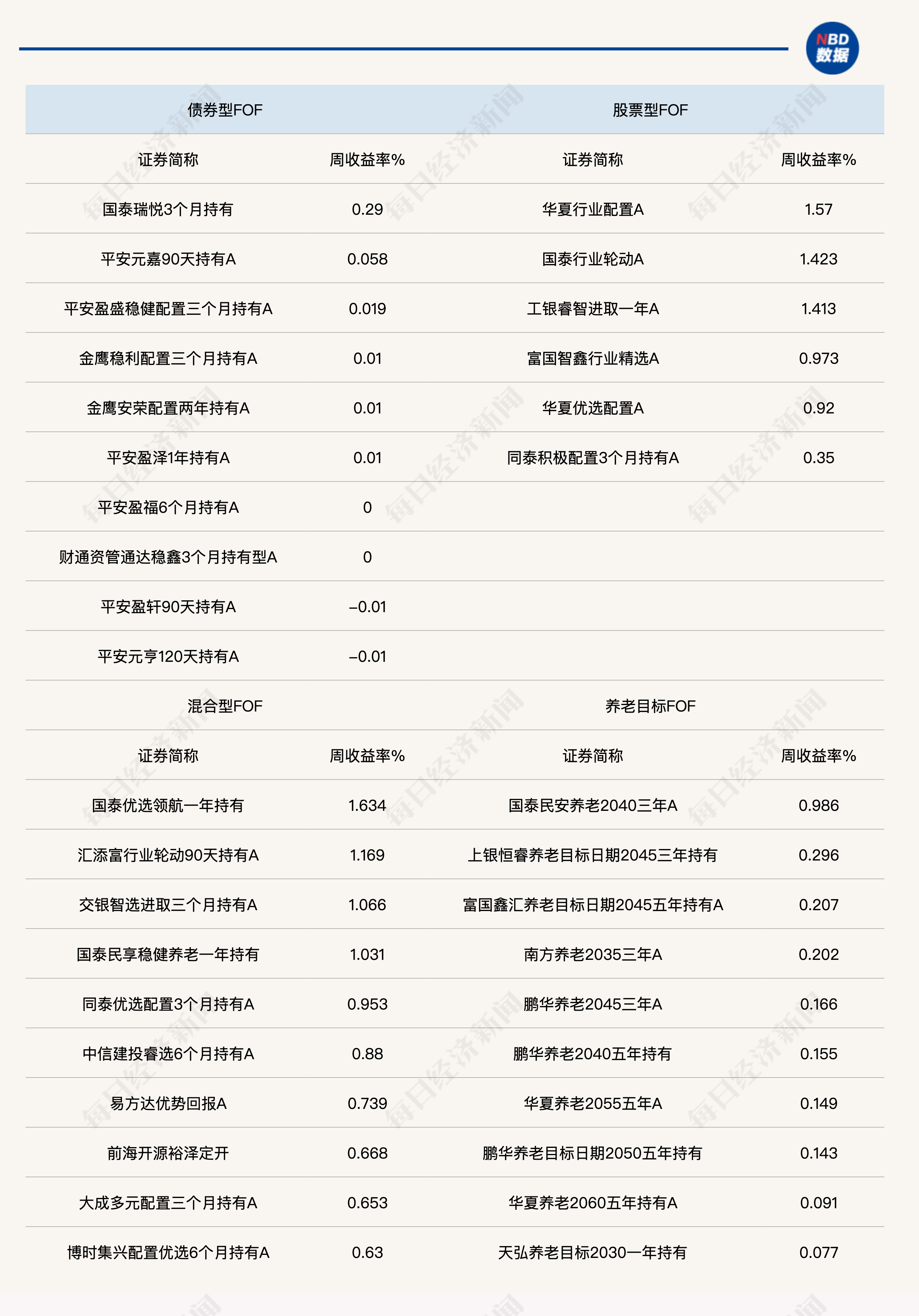 受此帶動,權益類FOF的業績修復明顯。Wind統計顯示,上周,股票型FOF全部實現正收益,華夏行業配置A錄得1.57%漲幅;混合型FOF當中,國泰優選領航一年持有的單周業績達到1.63%,后者也是所有FOF中上周業績最好的一只。