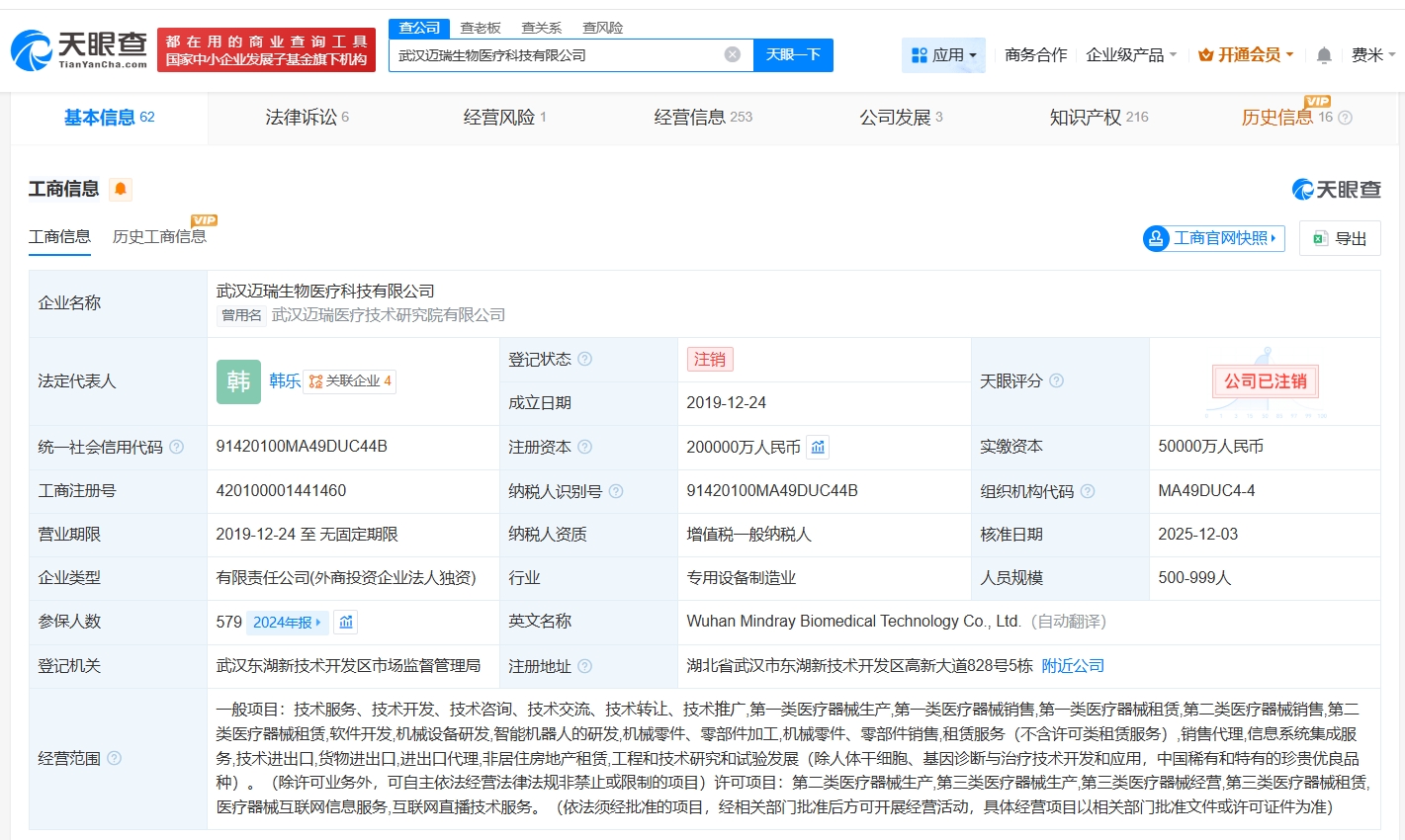 每經AI快訊,天眼查App顯示,近日,武漢邁瑞生物醫療科技有限公司登記狀態由存續變更為注銷,此前,該公司已發布注銷備案公告。該公司成立于2019年12月,法定代表人為韓樂,注冊資本20億元人民幣,經營范圍包括第一類醫療器械生產、第二類醫療器械銷售、智能機器人的研發等,由邁瑞醫療(300760)全資持股。