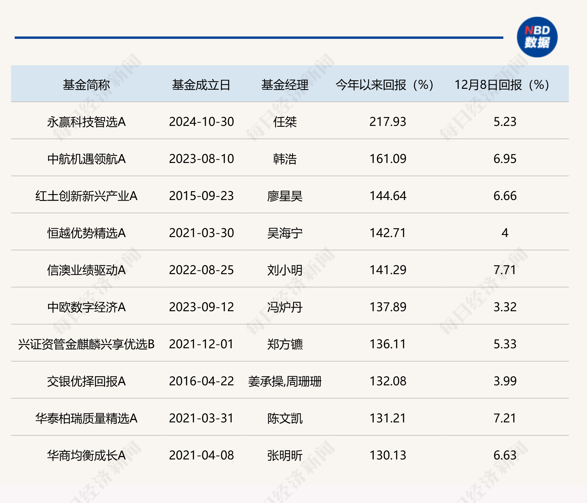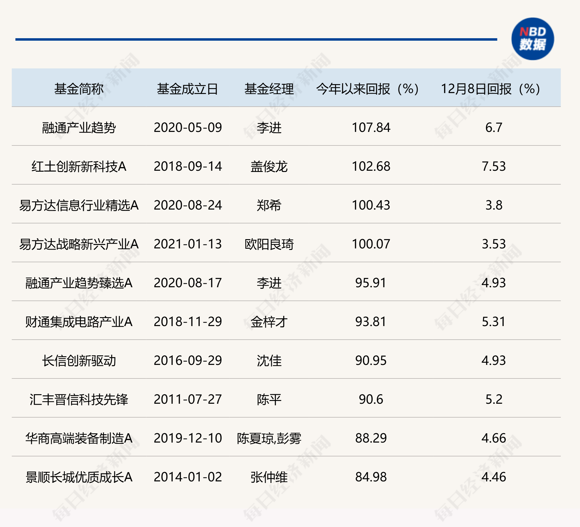 每經記者注意到,在12月8日漲幅靠前的產品中,不少也是今年的績優基金。例如紅土創新新科技A和紅土創新科技創新基金,年內收益分別排在同類970只產品中的第2位和第87位,華泰柏瑞質量成長A和諾德新生活A也都排在同類超4000只產品中前1%的位置。