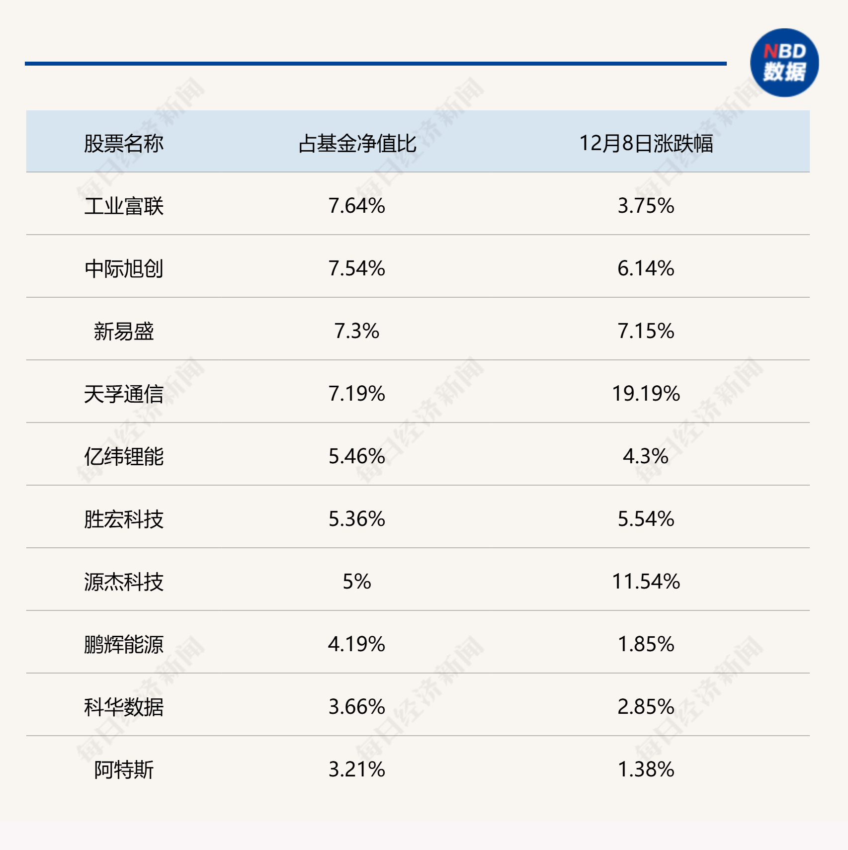 前十大重倉股持倉占比合計56.55%,雖然第一大重倉股工業富聯漲幅僅有3.75%,但第四大重倉股天孚通信漲停,源杰科技漲幅也超過10%,對基金凈值都有不錯貢獻。當然這是截至三季度末的重倉情況,從近幾天的連續上漲來看,該基金也有可能已經進行了調倉。