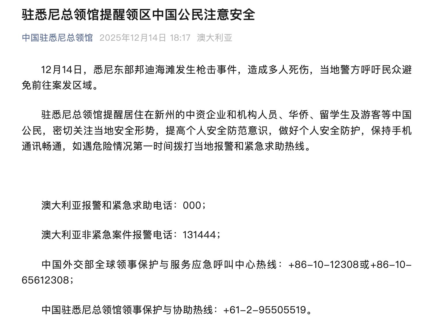 當(dāng)?shù)貢r(shí)間14日,中國(guó)駐悉尼總領(lǐng)館發(fā)布通知提醒領(lǐng)區(qū)中國(guó)公民注意安全。全文如下: