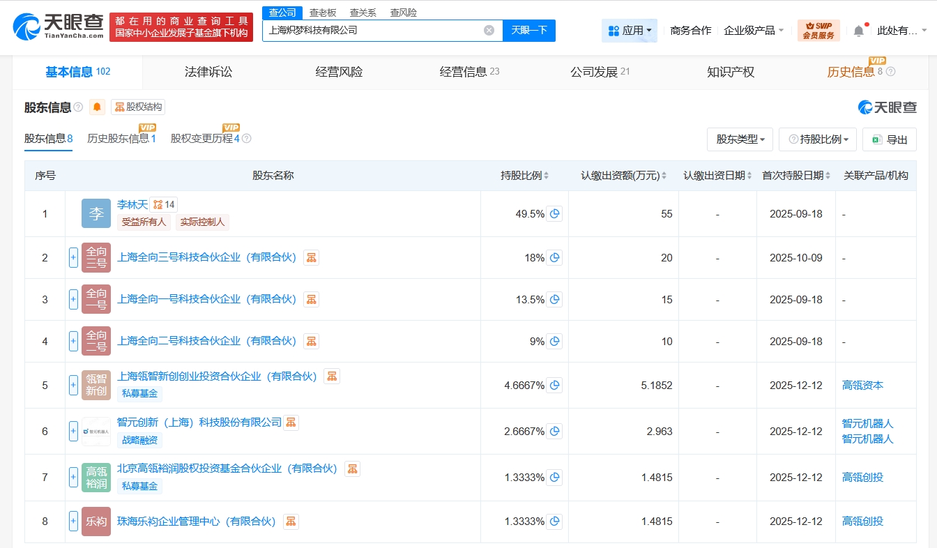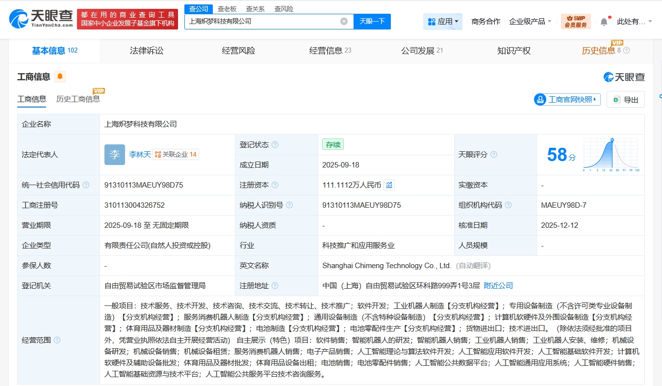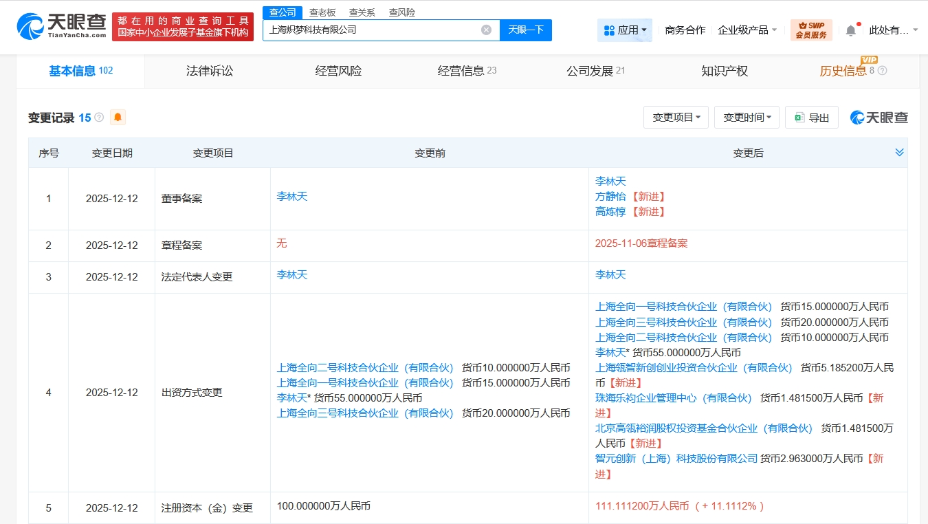 每經AI快訊,天眼查App顯示,近日,上海熾夢科技有限公司發生工商變更,新增智元機器人關聯公司智元創新(上海)科技股份有限公司等為股東,注冊資本由100萬元人民幣增至約111萬元人民幣,同時,部分高管也發生變更。上海熾夢科技有限公司成立于2025年9月,法定代表人為李林天,經營范圍含工業機器人制造、專用設備制造、服務消費機器人制造、通用設備制造、智能機器人的研發、人工智能理論與算法軟件開發、人工智能應用軟件開發等,現由李林天、上海全向三號科技合伙企業(有限合伙)及上述新增股東等共同持股。公開信息顯示,熾夢科技是一家陪伴機器人研發商。