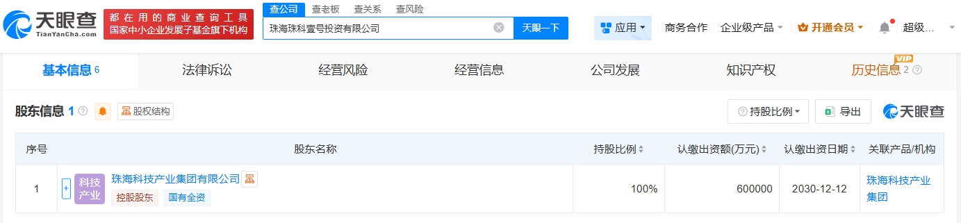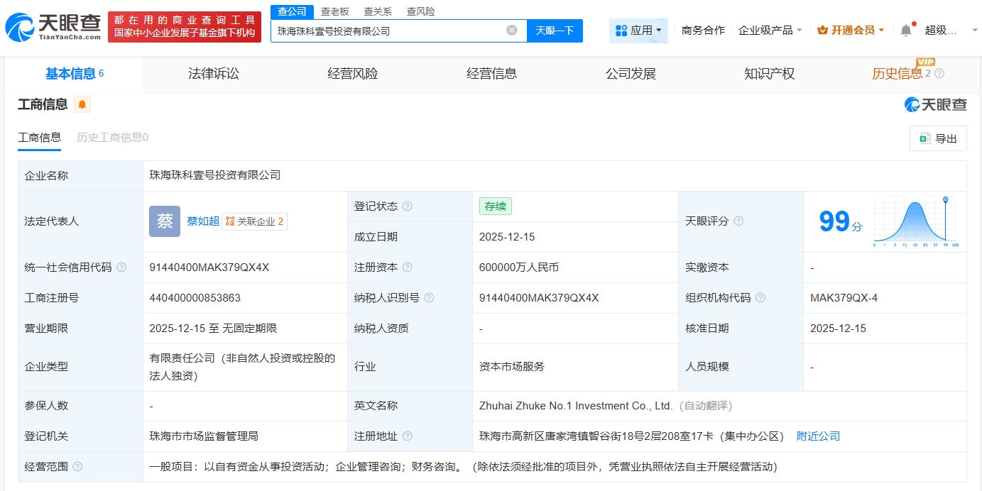 每經AI快訊,天眼查App顯示,近日,珠海珠科壹號投資有限公司成立,法定代表人為蔡如超,注冊資本60億元人民幣,經營范圍包括以自有資金從事投資活動、企業管理咨詢、財務咨詢。股東信息顯示,該公司由珠海科技產業集團有限公司全資持股。