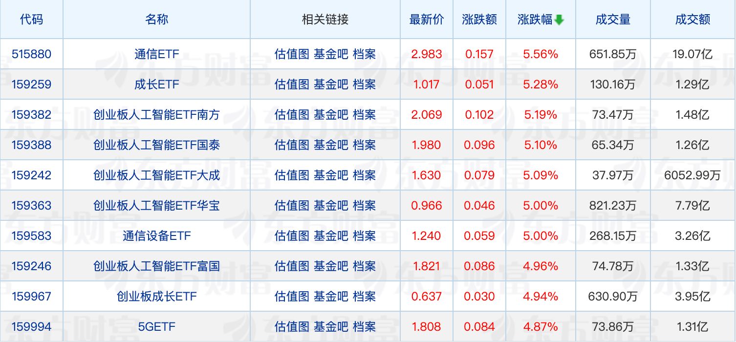 ETF漲跌幅方面,通信、人工智能相關ETF漲超5%。