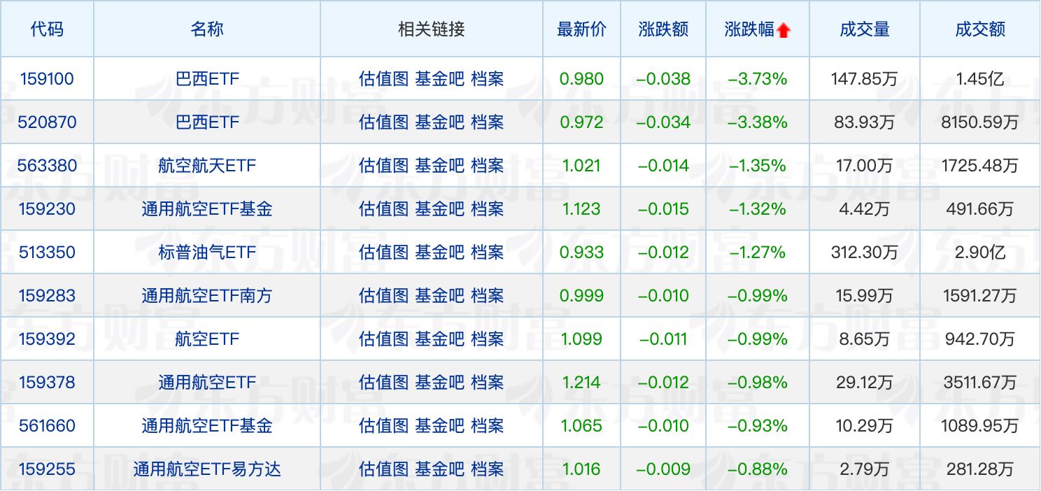 下跌方面,巴西ETF跌超3%,航天相關ETF跌約1%。