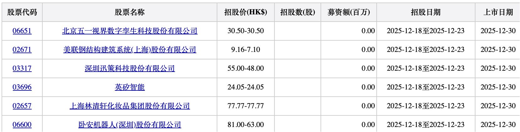 年末日益臨近,今日(12月18日)港股市場迎來IPO“晚高峰”,同一天之內,6家公司集中啟動招股,創下今年單日開啟招股數量最多紀錄。 今日開啟招股的六家公司分別為英矽智能(HK03696)、林清軒(HK02657)、臥安機器人(HK06600)、五一視界(HK06651)、迅策(HK03317)和美聯股份(HK02671)。根據計劃,這六家公司有望于12月30日集體在港交所上市。截至2025年12月30日,港交所今年預計將有超過117家新公司完成上市交易。 具體來看,今日招股的6家公司中,多家公司受到市場高度關注。 其中,五一視界被稱為“Physical AI第一股”,該公司的上市也是港股18C特專科技上市通道年度收官之戰。此次招股,全球發售2397.5萬股,香港發售119.9萬股,國際配售2277.6萬股,每股定價30.5港元,預計募資額7.31億港元,若行使超額配股權,最高可募資8.41億港元。 英矽智能是一家人工智能驅動的生物科技公司,公司依托自研的Pharma.AI平臺,高效搭建涵蓋超過30個創新項目的管線組合,在需求廣泛的腫瘤、免疫、纖維化、代謝等領域都有涉及。此次招股,招股價24.05港元,預計募資額22.77億港元。 臥安機器人定位為全球家庭機器人系統的提供商,產品涵蓋增強型執行機器人、智能感知系統等,主要市場包括日本、歐洲及北美。該公司擬全球發售2222.23萬股,其中香港發售占10%,國際發售占90%,另有15%超額配股權,每股發售價63~81港元,預計募資額14億~18億港元。 林清軒是中國高端國貨護膚品的代表,按全渠道銷售的總零售額計,公司的核心產品山茶花精華油自2014年以來連續11年于所有面部精華油產品中位居全國榜首。該公司擬全球發售1396.65萬股,其中香港發售占10%,國際發售占90%,另有15%超額配股權,每股發售價77.77港元,預計募資額為10.8億港元。 迅策是中國實時數據基礎設施及分析解決方案供應商,按2024年收入計,公司于中國資產管理行業的實時數據基礎設施及分析市場中排名第一,市場份額為11.6%。此次招股,招股價48~55港元,預計募資額為10.8億~12.3億港元。 美聯股份是中國預制鋼結構建筑市場工業領域的主要服務商之一,根據弗若斯特沙利文報告,按2024年收入計,公司于中國預制鋼結構建筑市場的工業領域中排名第三,市場份額為3.5%。此次招股,發售價為7.10~9.16港元,預計募資額為1.74億~2.25億港元。 除了上述六家公司今日開啟招股外,輕松健康(HK02661)、翰思艾泰-B(HK03378)和諾比侃(HK02635)三家公司將在今日截止招股,預計將于12月23日上市。 統計顯示,每到年中或者年末,港股市場都會迎來IPO高峰期。今年6月30日,當天共有包括藍思科技(HK06613)在內的5家公司啟動招股,此外還有兩家公司處于招股期之中。 此外,根據上市安排計劃,如果招股順利,截至2025年12月30日,港交所今年將有超過117家新公司完成上市交易。不過,這也并非近10年來,港交所上市數量最多的一年。據華泰證券統計,2016年以來,此前在2018年、2019年和2020年,每年都有超過100只新股上市。其中,2019年上市數量最多,達到139只,2020年130只,2018年有125只。新股上市數量最少的,則是2024年,僅有67只新股上市。 而從打新勝率和打新收益率來看,今年截至12月12日,打新勝率達到73%,為2016年第二高,僅次于2016年的74%,而且打新收益率也較前幾年大幅提升,達到34%。