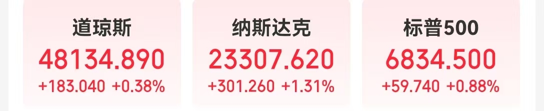 當(dāng)?shù)貢r(shí)間12月19日,美股三大指數(shù)集體收漲,道指漲0.38%,納指漲1.31%,標(biāo)普500指數(shù)漲0.88%。