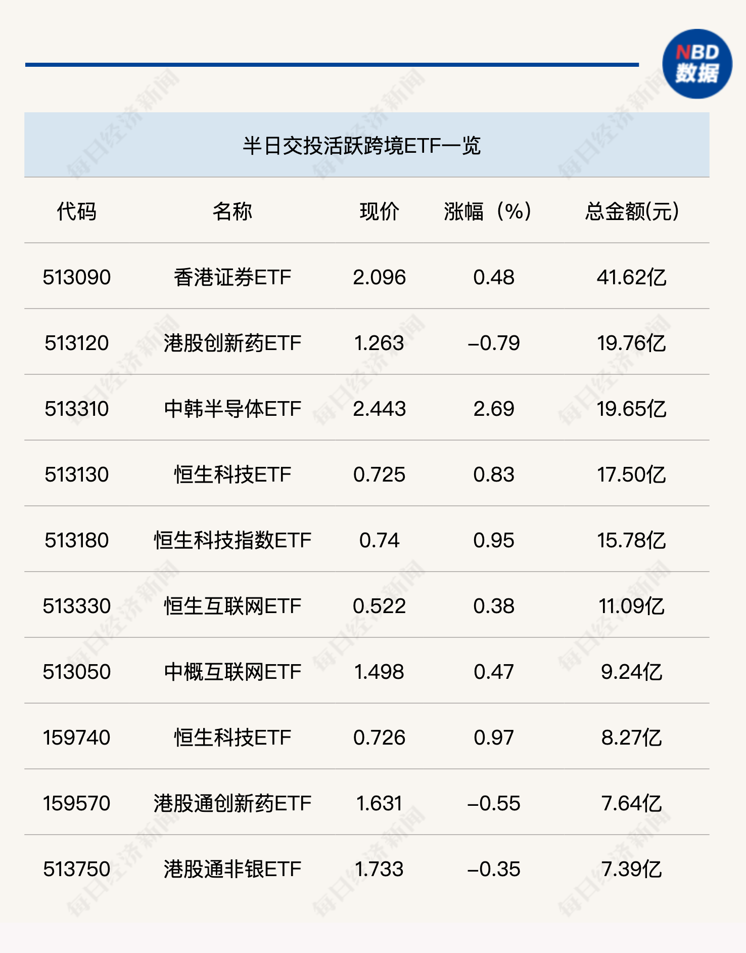 今日上午,科創芯片ETF(588200)交投相對活躍,半日成交金額近20億元;通信ETF(515880)顯著放量,半日成交金額達到10.77億元。跨境ETF方面,香港證券ETF(513090)半日成交金額為41.62億元,成交金額相對較大。