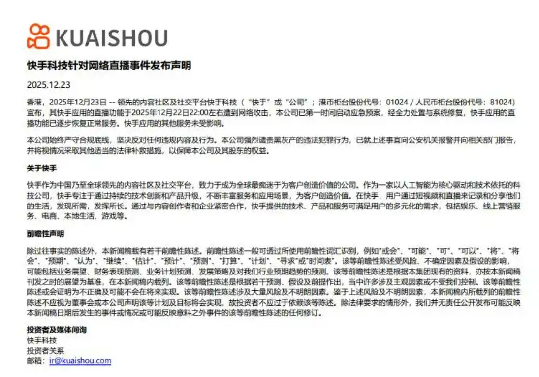 12月23日,快手發布最新公告,公告稱,公司快手應用的直播功能于2025年12月22日22:00左右遭到網路攻擊,公司已第一時間啟動應預案,經全力處置與系統修復,快手應用的直播功能已逐步恢復正常服務。快手應用的其他服務未受影響。