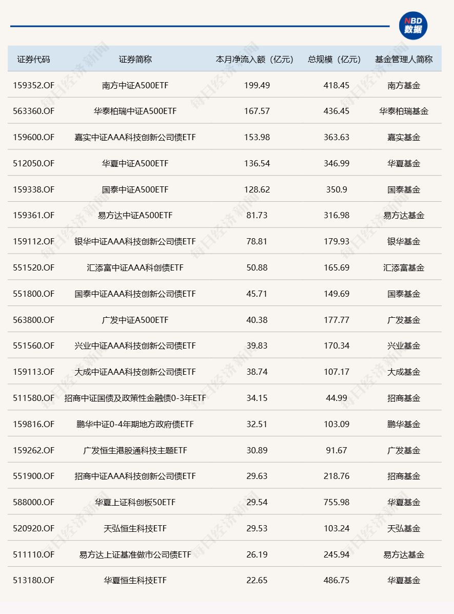 Wind數據顯示,在12月23日的非貨幣ETF市場中,嘉實中證AAA科技創新公司債ETF基金份額增加0.41億份,凈流入額40.94億元;興業中證AAA科技創新公司債ETF份額增加0.37億份,凈流入額37.41億元;易方達中證A500ETF份額增加25.86億份,凈流入額31.17億元。