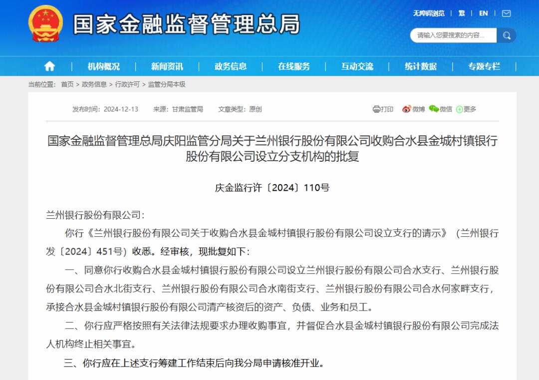 2024年12月,國家金融監督管理總局批準了蘭州銀行收購合水縣金城村鎮銀行和甘肅西固金城村鎮銀行的申請。