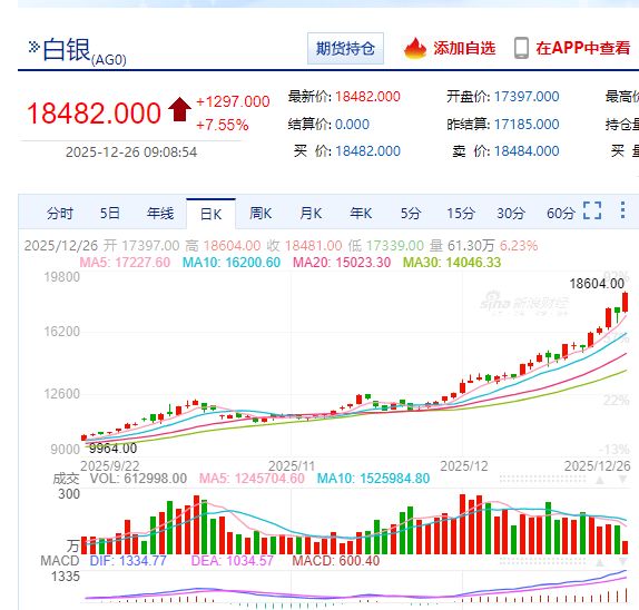 12月26日,滬銀期貨主力合約一度大漲超8%,截至發稿報18482元/千克。