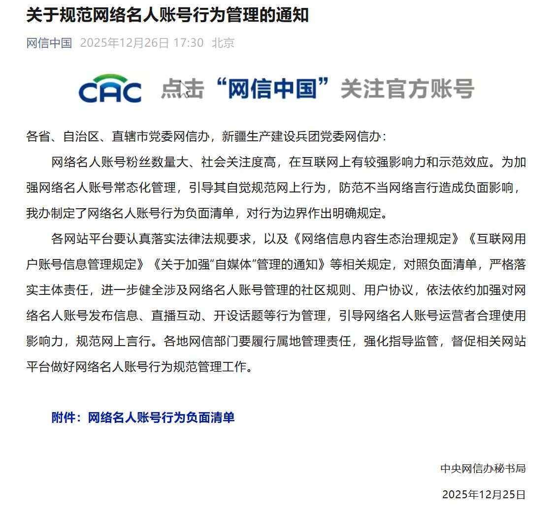 “網(wǎng)信中國”12月26日消息,中央網(wǎng)信辦發(fā)布規(guī)范網(wǎng)絡(luò)名人賬號行為管理的通知,制定負面清單明確行為邊界,涵蓋傳播低俗內(nèi)容、宣揚不良價值觀、傳播不實信息、歪曲解讀政策、鼓動群體對立、隨意開盒掛人等13方面。要求網(wǎng)站平臺落實責任,健全規(guī)則,加強管理;各地網(wǎng)信部門履行屬地責任,強化監(jiān)管。